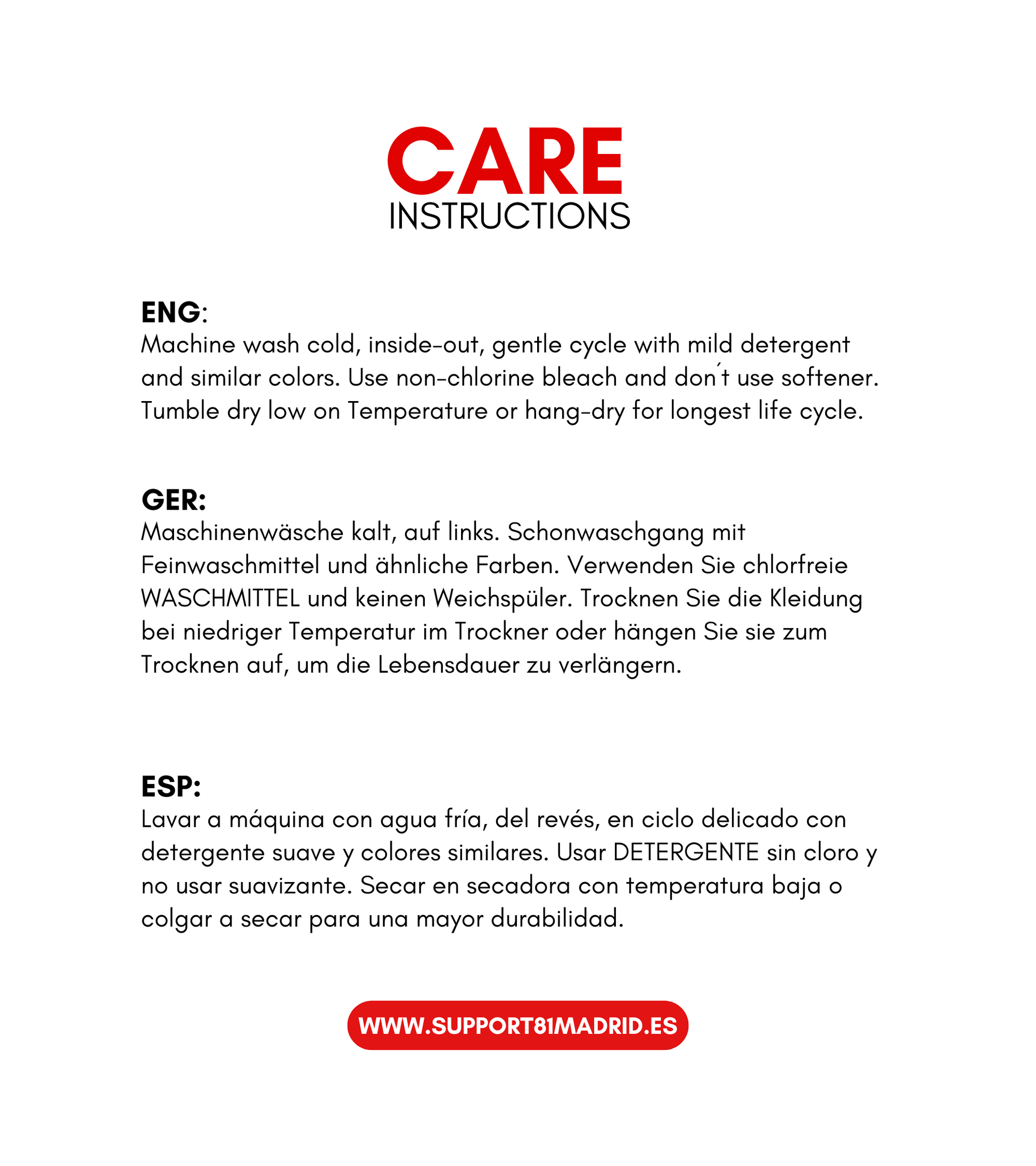 Lavado a máquina: frío (máximo 30C o 90F). No usa blanqueador y suavizante. No Planchar, vapor o secar. No lavar en seco.